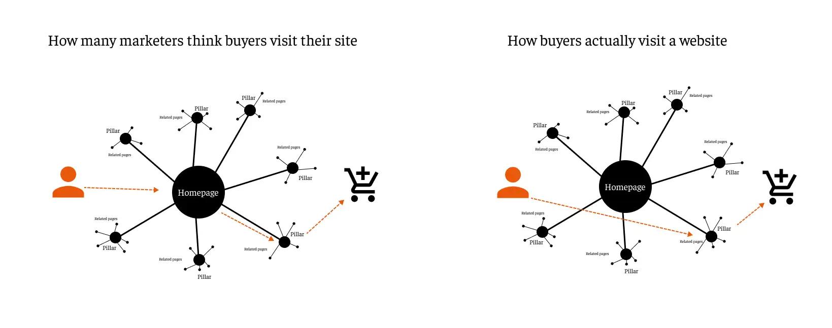 Most high-intent buyers first come to your website on a specific landing page. Realistically, this makes the landing page the “gateway” to their experience on your website, not your homepage. The job of a marketer is to build specific shopping experiences around each of these entrances.