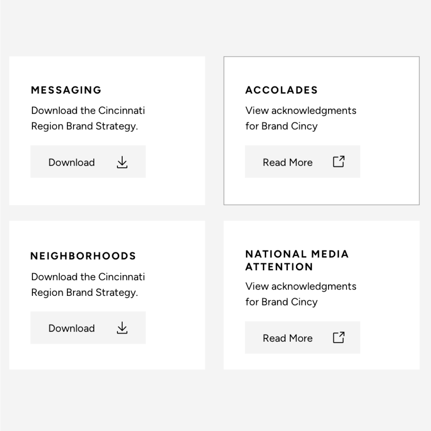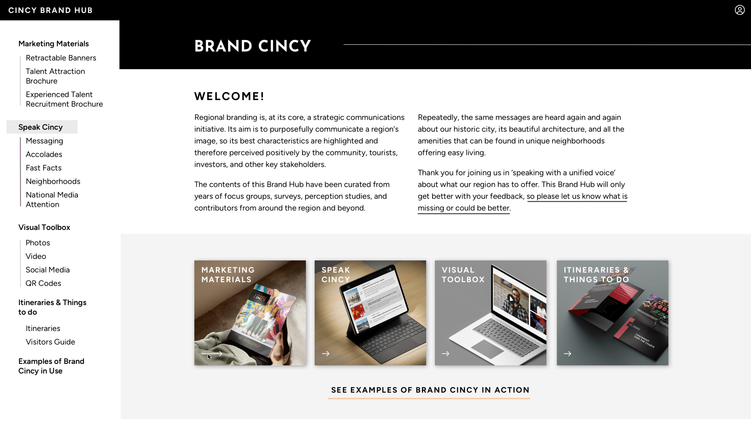 The available assets were divided into five main sections: Speak Cincy (copy guidelines), Marketing Materials (brochures and banners), Visual Toolbox (photos, video, social media links), Itineraries & Things to Do (visitors guides).